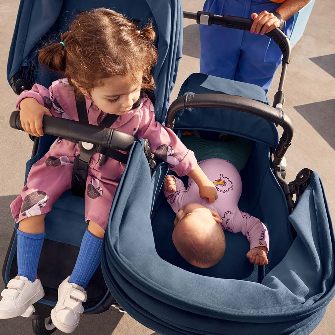Der Donkey 5 wird hier als Geschwisterkinderwagen angeboten. Sie können zwei Kinder unterschiedlichen Alters im Kinderwagen schieben. Dabei sitzen Ihre Kinder nebeneinander und nicht wie bei anderen Kinderwagen vor- oder übereinander. So können sie die Welt gemeinsam, Seite an Seite, erkunden. Auch als Geschwisterwagen lässt sich der Donkey 5 Duo mühelos schieben und ist leicht zu lenken. Er passt mit einer geringen Breite von 74 cm durch jede Tür mit Standardmaß. So können Sie entspannt durch den Alltag gehen. Wenn Sie nur mit einem Ihrer Kinder unterwegs sind, lässt sich der Geschwisterkinderwagen mit wenigen Handgriffen in einen schmaleren Kombikinderwagen mit extra viel Stauraum umbauen. Der hier angebotene Kinderwagen ist in der Styled by You Version. Das bedeutet, dass Sie die Sonnendächer entsprechend Ihrer Wünsche auswählen können. Es gibt auch die Möglichkeit von Bugaboo vorausgewählte Styles zu wählen, bei denen die Liegewanne, Sitzeinheit und die Sonnendächer farblich abgestimmt sind.