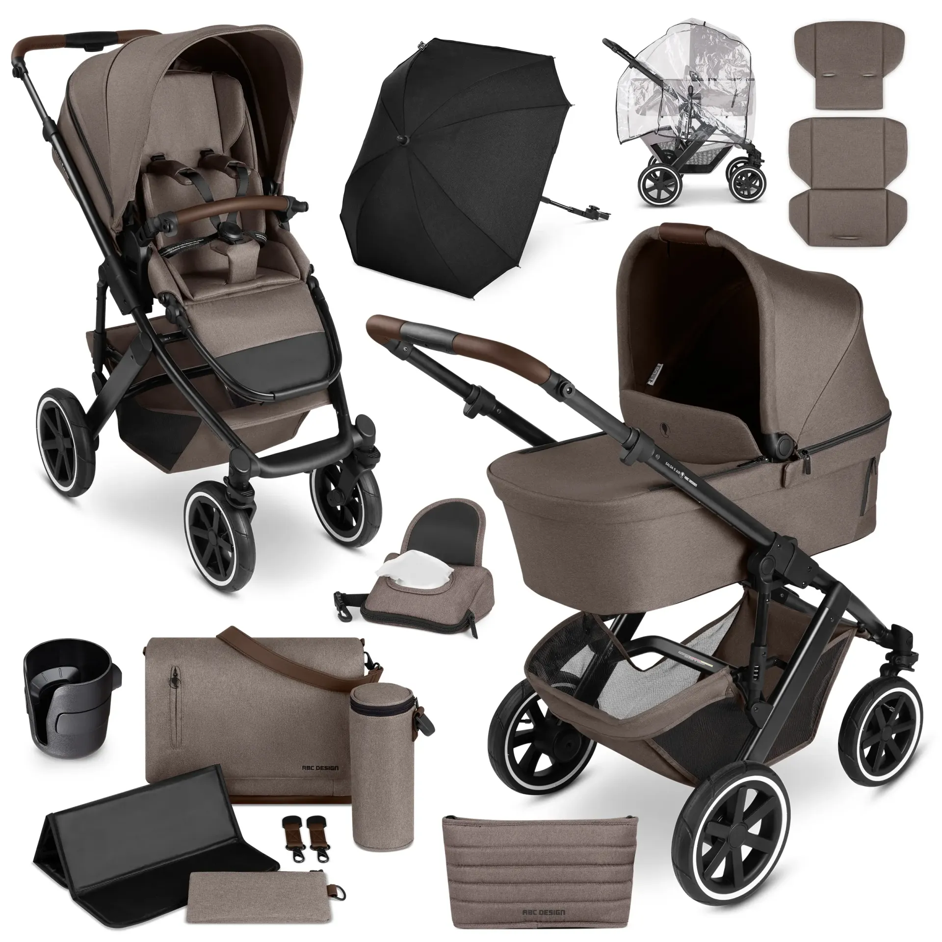 Lieferumfang: Salsa 5 Air Rahmen inkl. Lufträder, Faltbare Babywanne inkl. Schutzdecke, Weiche CozyCloud® Matratze, Babywannen-Organizer, Sitzeinheit (inkl. Bezugsstoff), Komfort-Sitzauflage, HappyBelt® 5-Punkt-Gurtsystem mit Magnetverschluss, Einkaufskorb, Spiel- und Schutzbügel mit 2 Befestigungspunkten für Zubehör, Sonnenverdeck (UPF50+), Bedienungsanleitung, Sonnenschirm Sunny mit Klickgelenk, Befestigung für ABC Design Klick-System, Universal-Befestigung für runde und ovale Gestelle, Wickeltasche Urban, Isolierter Flaschenhalter, Wickelunterlage mit Thermobeschichtung, Utensilientasche, Befestigung für Schiebe-Griff (ABC Design Klick-System), Schultergurt, ABC Design Regenschutz für Samba und Salsa, Becherhalter, Universal-Halterung mit Klettverschluss