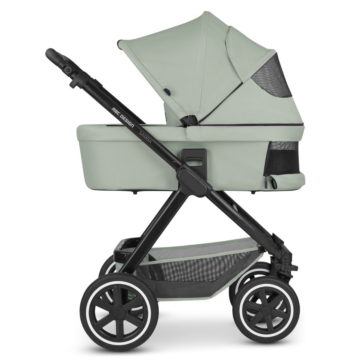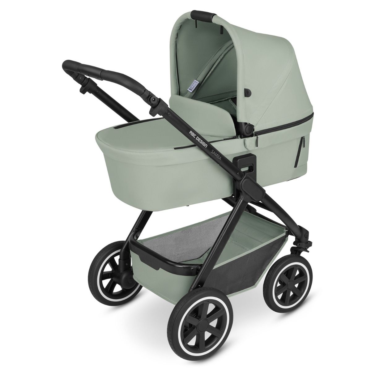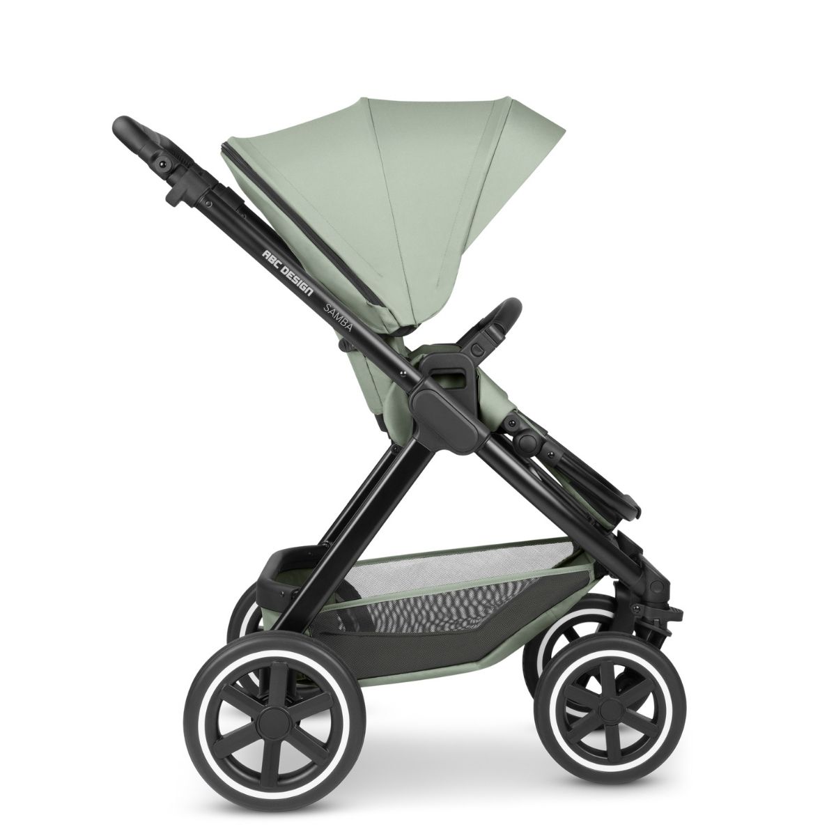 Der ABC Design Samba Kombikinderwagen tanzt mit Ihnen Samba! Seine gemütliche Babywanne ermöglicht es Ihnen, bis zum 6. Monat komfortabel mit Ihrem Baby unterwegs zu sein. Der Sportsitz bietet nicht nur vier einstellbare Rückenlehnenpositionen, eine verstellbare Fußstütze und ein extra großes Verdeck, sondern kann auch in beide Richtungen montiert werden. Die Luftkammerreifen und die effiziente Federung gewährleisten eine ruhige Fahrt auf jedem Terrain, sei es in der Stadt oder auf unebenen Wegen. Der Samba besticht zudem mit einem verstellbaren Teleskopschieber, der sich ergonomisch an jede Körpergröße der Schiebenden anpasst. Dank des FlexiFold Systems lässt er sich in Sekundenschnelle kompakt zusammenklappen, . Mit seiner hochwertigen Verarbeitung, dem großen Einkaufskorb und praktischen Extras wie dem UV-Schutz im Verdeck bereichert der Samba jeden Ihrer gemeinsamen Tage!