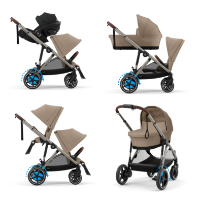 Das All-in-One-System des e-Gazelle S passt sich flexibel an für Ihre wachsende Familie! Es bietet Ihnen die Möglichkeit, den Kinderwagen ganz nach Ihren Wünschen und den Bedürfnissen Ihrer kleinen Lieblinge zu gestalten. Ob Sie eine kuschelige Babywanne für die ersten Monate, eine gemütliche Sitzeinheit für später oder eine praktische Babyschale für schnelle Ausflüge benötigen – Sie können alles nach Belieben kombinieren. Und das Beste daran: Das System ist so flexibel, dass es sogar Platz für zwei kleine Passagiere bietet, wenn nötig. So sind Sie immer bestens vorbereitet, egal was der Tag bringt!