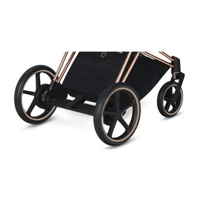 Die Räder des e-Priam sind aus einem unplattbaren Material, das mit seinen federnden Eigenschaften, die Allradfederung des e-Priam unterstützt. Vor Vorderräder sind feststellbar und haben wie auch die Hinterräder an den Außenseiten farblich ans Gestell angepasste Reflektionsstreifen.