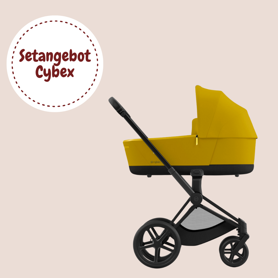 Lieferumfang des Sets: Priam 4 Rahmen inkl. Sitzrahmen mit Unterkorb, Babywanne Lux Carry Cot inklusive Regenverdeck, Bezug für den Sitz inklusive Regenverdeck, Wannen/Babyschalen Adapter, Cybex Platinum Fußsack, Cybex Platinum Wickeltasche
