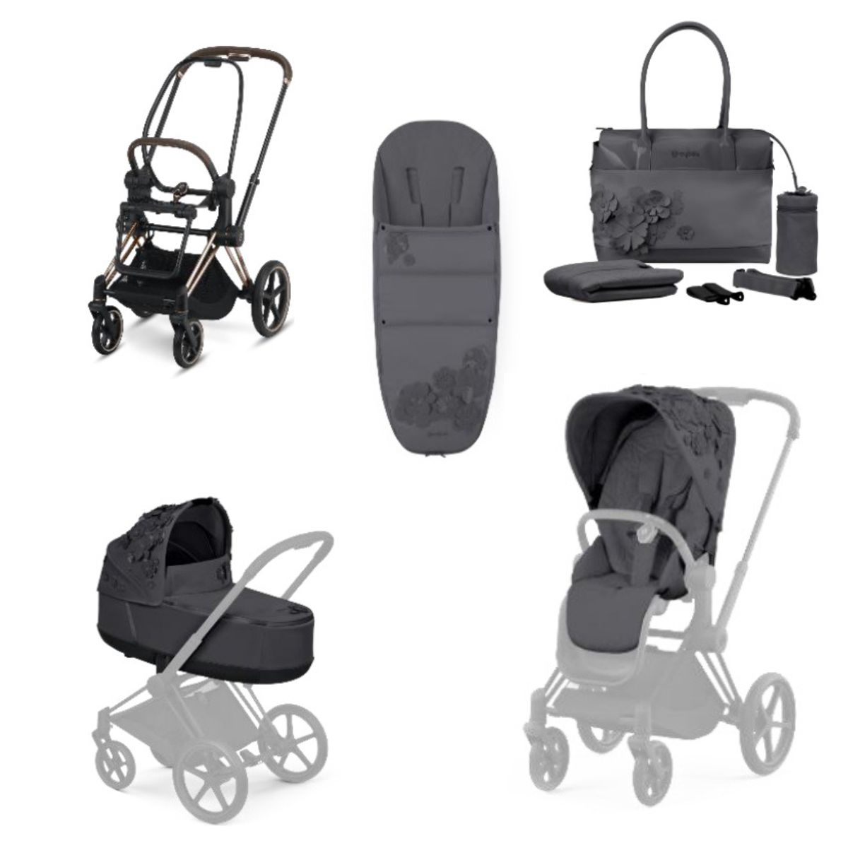 Dieses Setangebot ist nicht nur ein wahrer Hingucker, sondern ist auch noch undenkbar günstig! Die enthaltenen Artikel statten Sie komplett für eine lange Zeit aus, sodass Sie sich keine Gedanken mehr um Neugeborenenausstattung für unterwegs machen müssen. Die erhalten den Cybex Priam 3.5 in Rosegold mit dem wunderschönen Sitzbezug, die passende Liegewanne Lux, einen dazugehörigen Fußsack und die Wickeltasche. Alle Artikel gehören zu der Simply Flowers Grey-Edition, die sich durch wunderschöne dunkelgraue Farbe mit aufgesetzten Blumen auszeichnet.