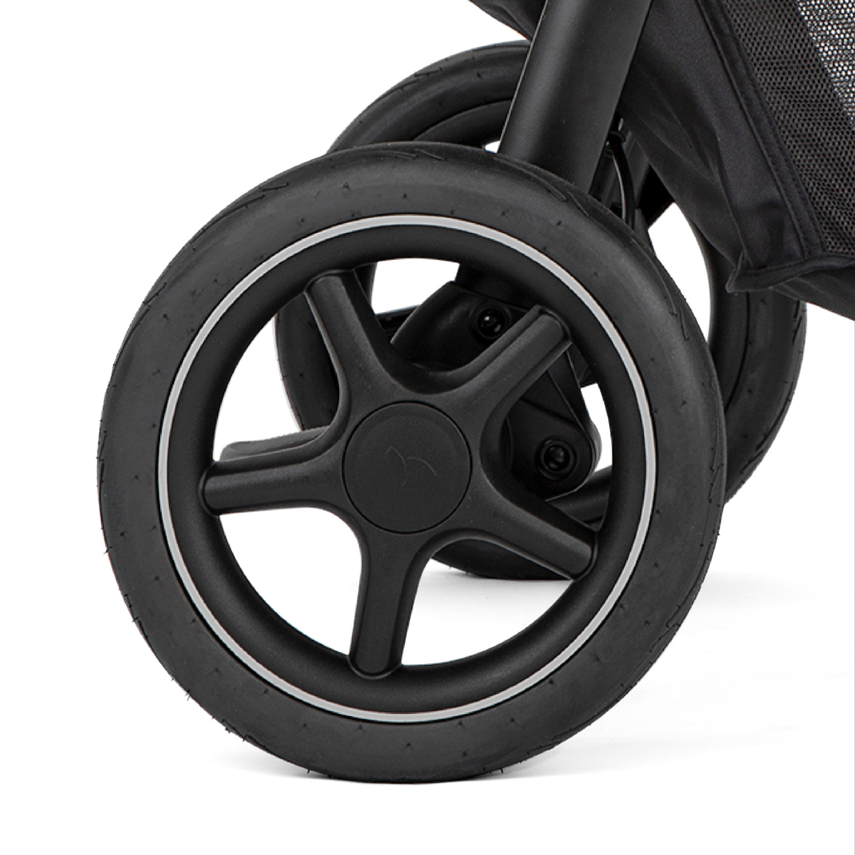 Die abnehmbaren Vorder- und Hinterreifen mit Kugellager bestechen durch ihre 4 Rad Einzelfederung und die Schaumstofffüllung. Dadurch ist jeder Panne vorgebeugt! Die Vorderräder sind außerdem schwenk- und feststellbar.