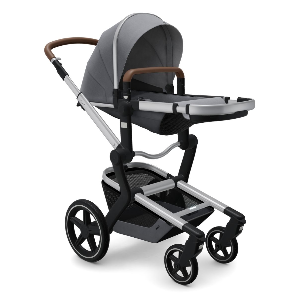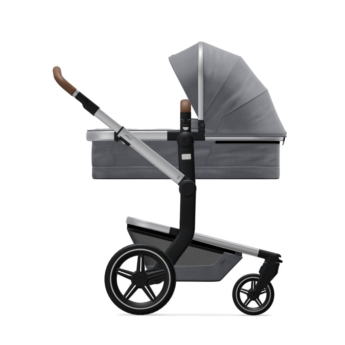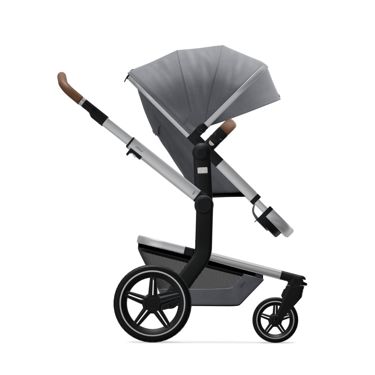 Das neue Raddesign des Joolz Day+ und die verbesserte Federung unterstützen ein angenehmes Schiebe- und Fahrgefühl. Die Bremse ist leicht mit einem Fuß zu bedienen und das Verdeck kann ganz eingefaltet werden oder durch die ausklappbare Sonnenblende verlängert werden. Der Schiebebügel kann in unterschiedliche Höhen eingestellt werden und passt sich dadurch jedem Schiebenden an. Der Joolz Day+ wächst auch mit dem Kind mit. Zuerst liegt es bequem und komfortabel in der großen Wanne auf einer atmungsaktive Matratze mit Kopfpolster. Später sitzt das Kind genauso angenehm im ergonomischen Sitz, bei dem man mit wenigen Handgriffen sowohl die Gurte als auch die Fußstütze der Größe des Kindes anpassen kann. Die Sitzeinheit kann mit Blick nach vorne oder zum Schiebenden aufgesetzt werden. Der Sitzbezug bietet eine eingearbeitete Rücken- und Nackenstütze für ein optimales Sitzgefühl. Die Gurte sind in Schulterhöhe und Gurtlänge stufenlos zu verstellen und die Gurtschnalle ermöglicht ein reibungsloses Anschnallen des Kindes über einen Click & Go Verschluss. Zum Hineinsetzten oder Herausnehmen des Kindes kann der Sicherheitsbügel mit einer Hand geöffnet werden und nach allen Seiten weggedreht werden. Und wenn beim Familienausflug ein Hochstuhl benötigt wird, hat der Day+ Sitz die ideale Tischhöhe.