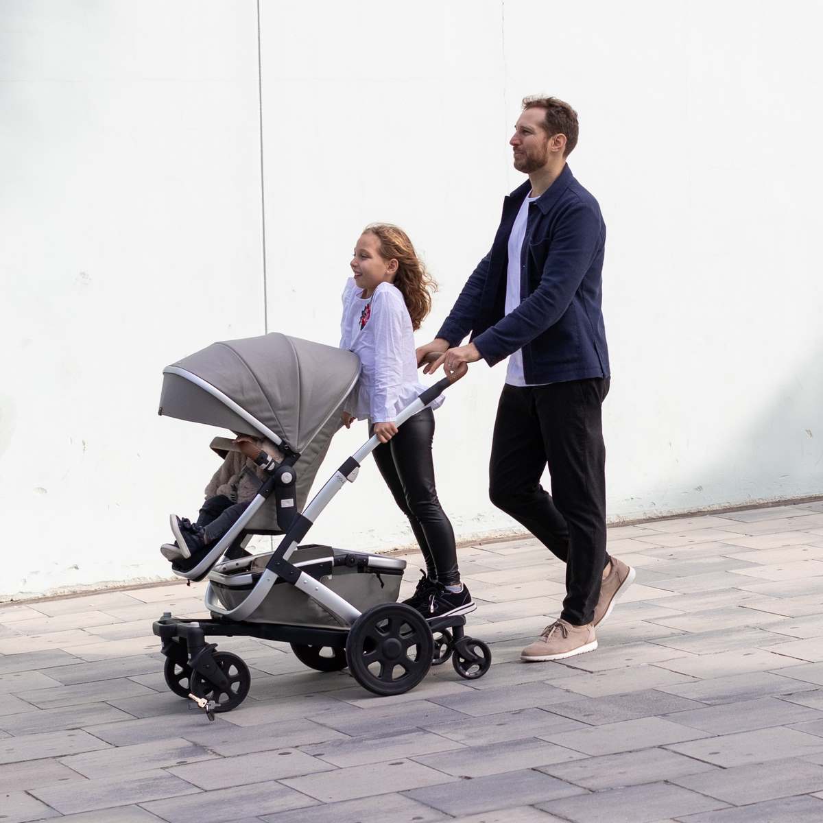 Das Joolz Mitfahrbrett ermöglicht es dem Kind, bequem zu stehen und mit den Eltern rasch voranzukommen.