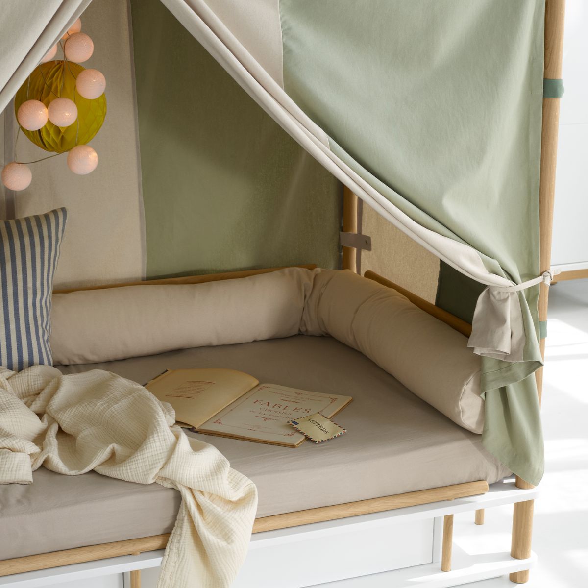 In einem gemütlichen Kinderzimmer gibt es einen magischen Ort, an dem Träume lebendig werden und die Vorstellungskraft frei entfalten kann. Hier steht ein ganz besonderes Bett, umhüllt von einem zauberhaften Betthimmel namens Circus. Dieser Himmel, aus kräftigem, unbehandeltem Canvas gefertigt, ist mit fröhlichen grünen Streifen geschmückt, die an die bunten Zelte eines Zirkus erinnern. Mit einem einfachen Haken an der Decke wird das Kinderzimmer in eine beeindruckende Zirkusmanege verwandelt. Die Seiten des Himmels können hochgerollt oder zur Seite geschlagen werden und schaffen so einen Raum voller Möglichkeiten für spannende Abenteuer und spektakuläre Vorstellungen. Wenn die Zeltwände heruntergelassen werden, fühlt es sich an, als ob ein Unsichtbarkeitsumhang über dem Bett schwebt – ein großartiger Rückzugsort zum Verstecken, Spielen, Lesen und Schlafen! Der Betthimmel Circus wird somit nicht nur zu einem schützenden Rückzugsort, sondern zu einem magischen Portal, das unvergessliche Abenteuer verspricht. Hier wird jeder Schlaf zu einem neuen, aufregenden Kapitel einer wunderbaren Geschichte.