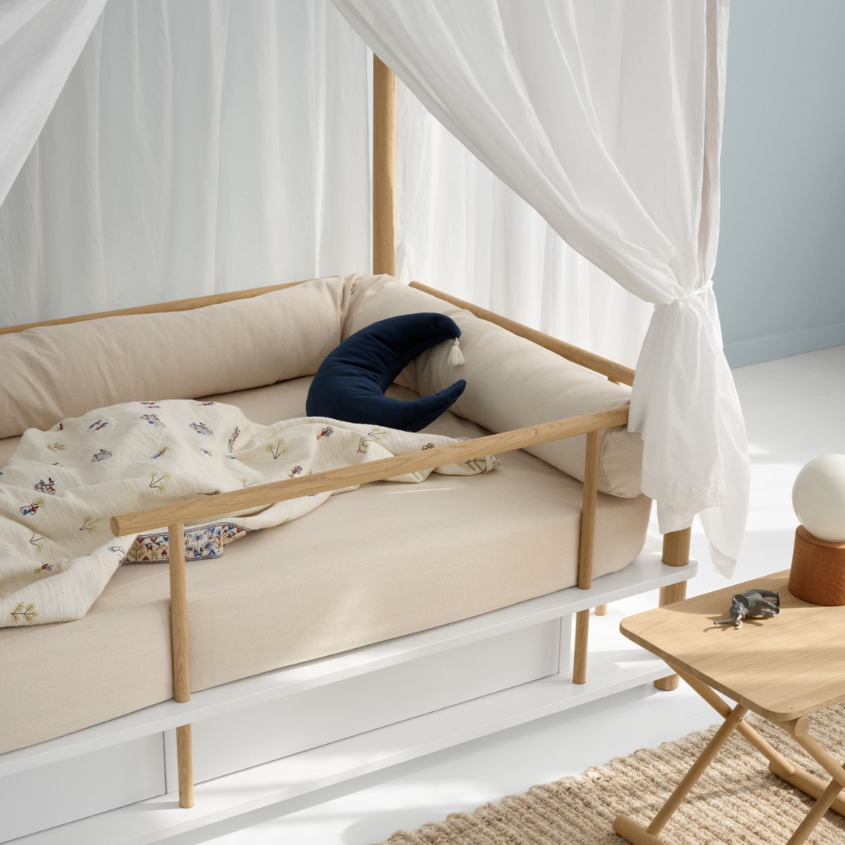 Der Camp Betthimmel Sahara verwandelt das Kinderzimmer in einen einladenden Rückzugsort für kleine Abenteurer, die die Wunder der Wüste erkunden möchten. Aus sanftem, halbtransparentem Baumwollstoff gefertigt, strömt das Licht auf zauberhafte Weise ein und schafft eine behagliche Atmosphäre. Die hohe Zeltkonstruktion, die von einem Haken an der Decke hängt, umhüllt das Bett von allen Seiten und vermittelt Ihrem Kind ein Gefühl von Sicherheit. Nach einem aufregenden Tag voller Erkundungen in den endlosen Sanddünen der Sahara kehrt Ihr kleiner Entdecker ins Basislager zurück. Dort träumt Ihr Kind von mutigen Wüstenreisenden, die versteckte Oasen finden und geheimnisvolle Tiere beobachten. Mit einem einfachen Handgriff lässt sich der Betthimmel öffnen und an den Bettpfosten befestigen, sodass Ihr Kleines den Blick auf den neuen Tag genießen kann. In diesem geschützten Raum ist es der perfekte Moment, Mama und Papa einzuladen, die gerne eine Gute-Nacht-Geschichte erzählen. Der Camp Betthimmel Sahara wird so nicht nur zu einem gemütlichen Schlafplatz, sondern auch zu einem magischen Ort, an dem die Fantasie Ihres Kindes lebendig wird. Jede Nacht beginnt eine neue Traumreise durch die faszinierende Sahara, die die kindliche Vorstellungskraft anregt und zu unvergesslichen Erlebnissen einlädt.