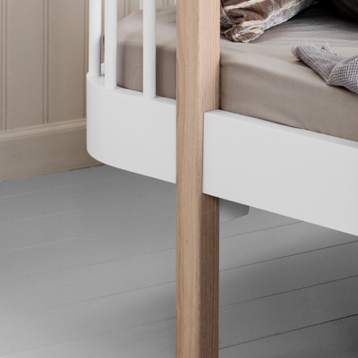 Für maximale Robustheit besteht das Etagenbett aus massivem Birkenholz und MDF, einem Holzwerkstoff, der zu 60 % aus Birke, 20 % aus Kiefer und 20 % aus Espe hergestellt wird. Die Beine sind entweder aus weiß lackierter massiver Birke oder weißgeölter massiver Eiche gefertigt. So hält das Bett jeglichem Trubel stand.