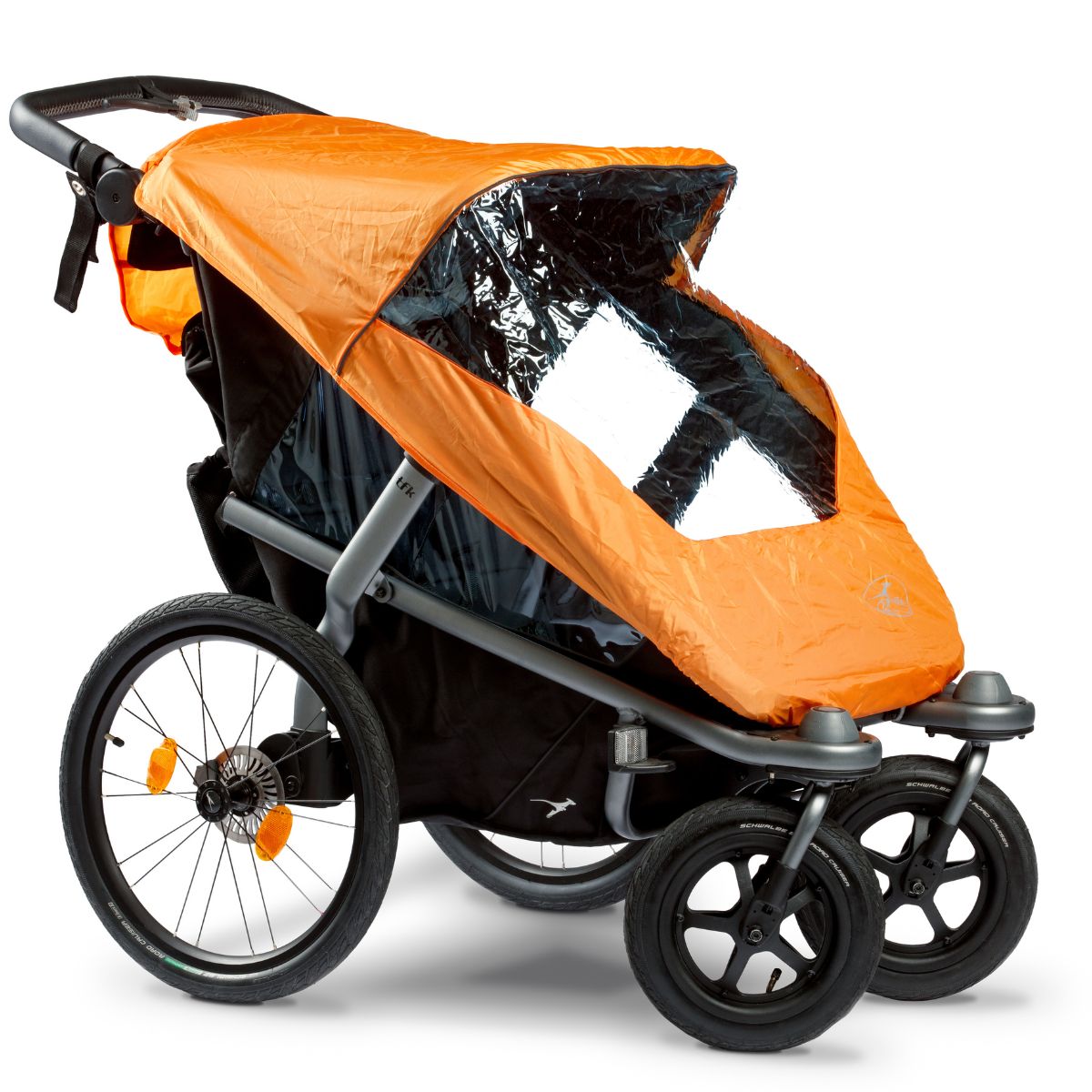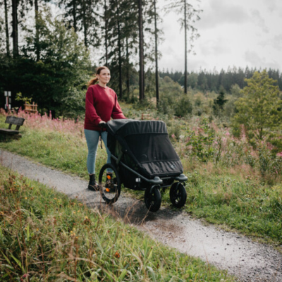In einer kleinen Tasche ist ein Wetterschutz eingebaut, der schnell über den Wagen gezogen werden kann. Durch seine orangene Farbe sorgt er zusätzlich für mehr Sichtbarkeit im Straßenverkehr. Bei langen Touren und starkem Regen empfehlen wir den zusätzlich erhältlichen Regenschutz. Er geht an den Seiten tiefer und schützt so besonders gut vor Regen und Wind.