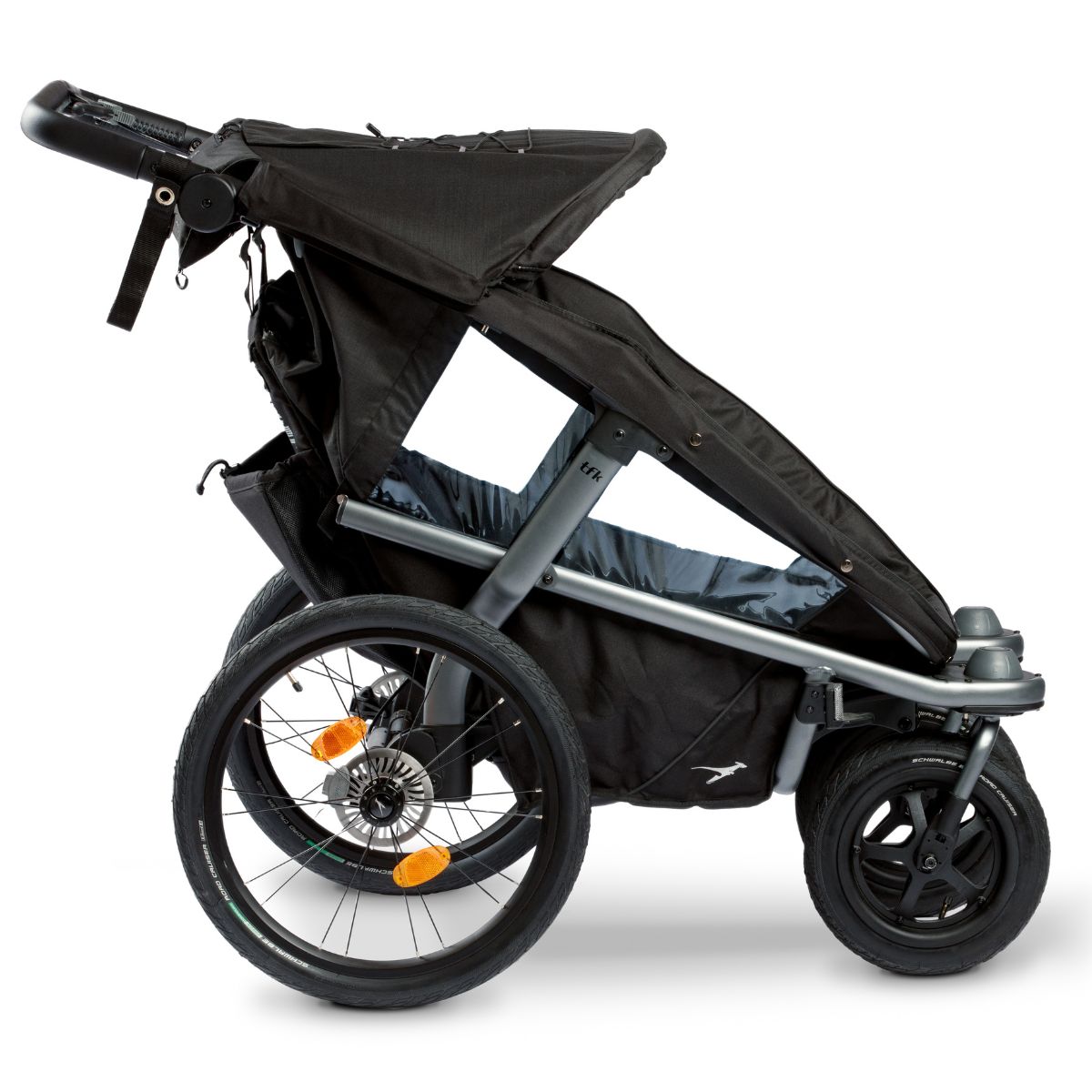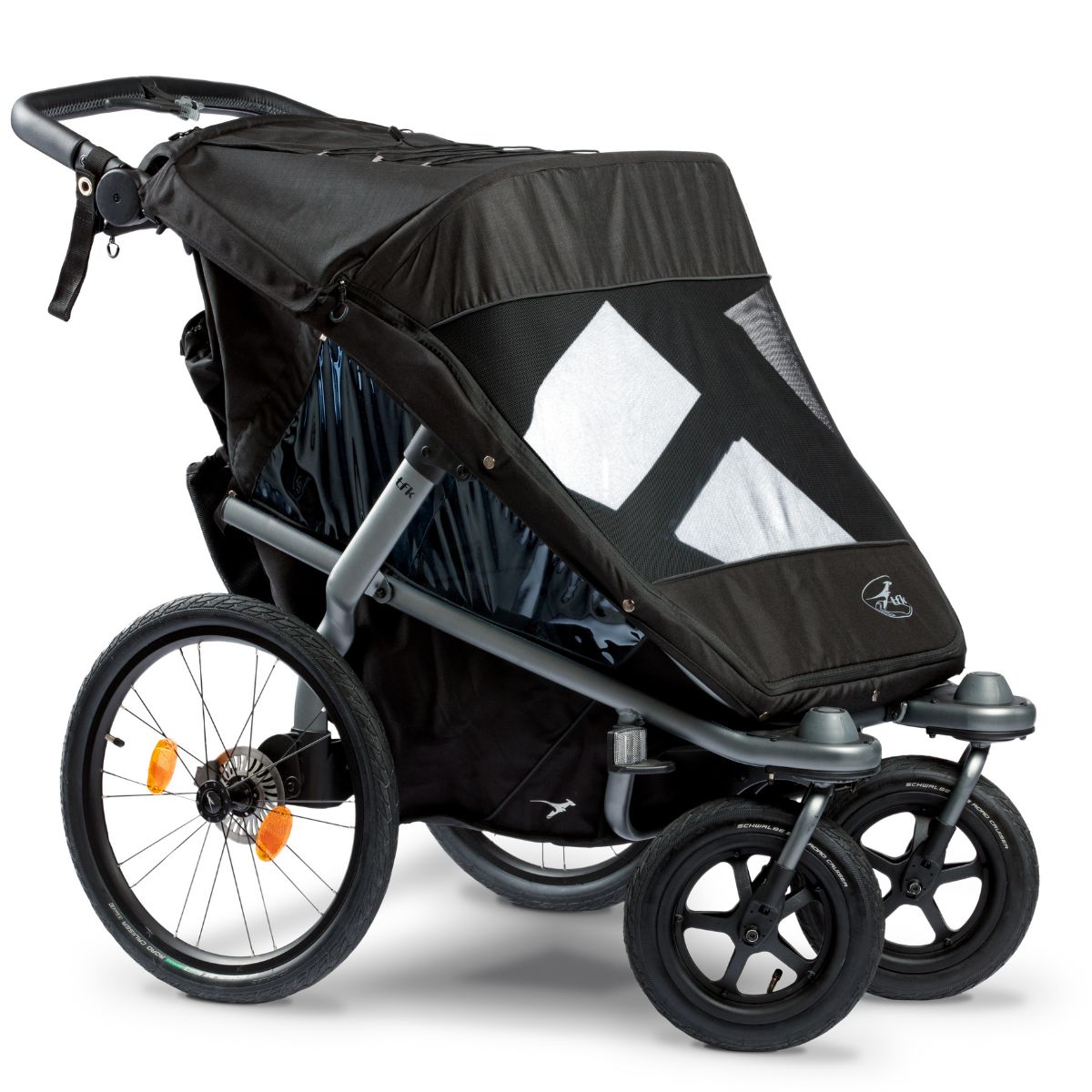 Der hochwertig verarbeitete Velo 2 ist mit schmutz- und wasserabweisenden Stoffen ausgestattet, die mit einem UV-Schutz von UPF 50+ auch vor starker Sonneneinstrahlung schützen. Der Rahmen ist leicht und robust zugleich. Durch die hochwertige Bereifung mit Lufträdern ist der Velo 2 für jedes Gelände perfekt ausgestattet. Die 20” großen Hinterräder sind einzeln gefedert. Die kleineren und frei beweglichen Vorderräder mit 12” können festgestellt werden. Die Vorderräder auf den Bildern stammen zwar vom Hersteller Schwalbe, jedoch werden Mäntel des Herstellers Hota geliefert. Bitte haben Sie Verständnis, dass dies eine Entscheidung von TFK ist und wir keinen Einfluss darauf haben.