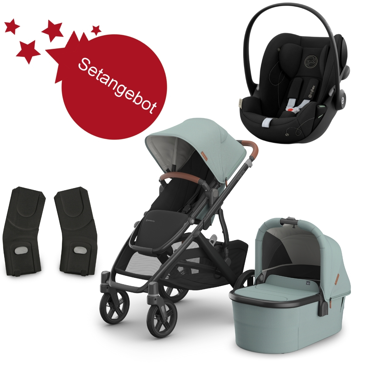 Lieferumfang: Babywanne V3 und Sportsitz, Gestell, Sonnenverdeck, Insektenschutz für die Babywanne, Regenschutz für die Babywanne, Sicherheitsbügel, Regenschutz für den Sportsitz, Insektenschutz für den Sportsitz, Aufbewahrungstasche, Saisonale Sitzauflage, Cloud G i-Size Babyschale Plus, Neugeborenen-Einlage, Babyschalenadapter für Vista