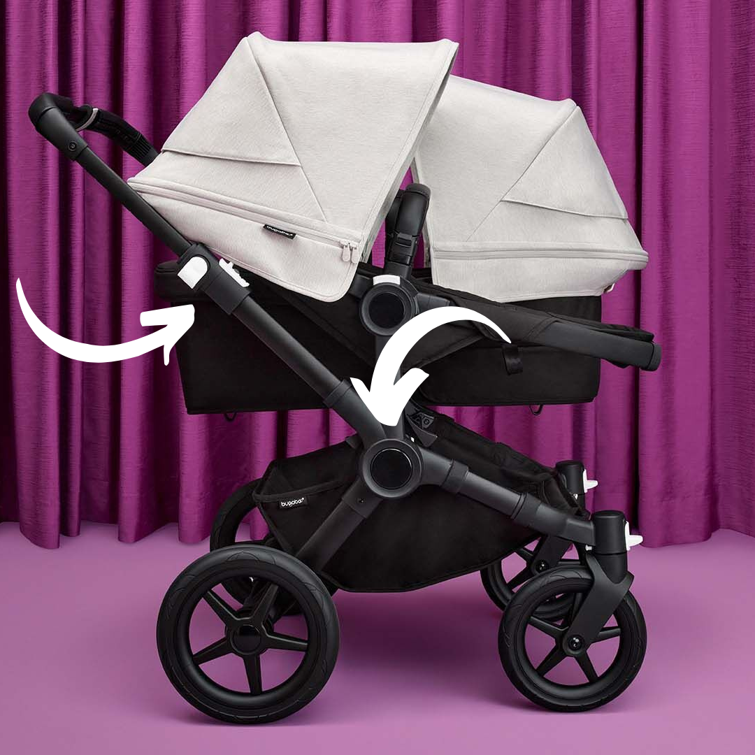 The Donkey Duo is ideal for families with children of different ages. It offers space for up to two children. A third child can even be transported with an additional travelling board. Are you expecting your first child and planning another? Then the Donkey 5 sibling pushchair is also suitable for you. Firstly, you can use it as a combi pushchair for your first child. You benefit from extra storage space in the form of a side basket. As soon as your second child is born, the Donkey 5 can be converted into a sibling pushchair with just a few clicks. This means that your children don't sit on top of or behind each other, but next to each other and can explore the world together. In the "Styled by Bugaboo" version offered here, you can choose from various colour-coordinated sets put together by Bugaboo. Would you like to set colourful accents? In the Styled by You version, you can choose the colour of the sun canopies individually.