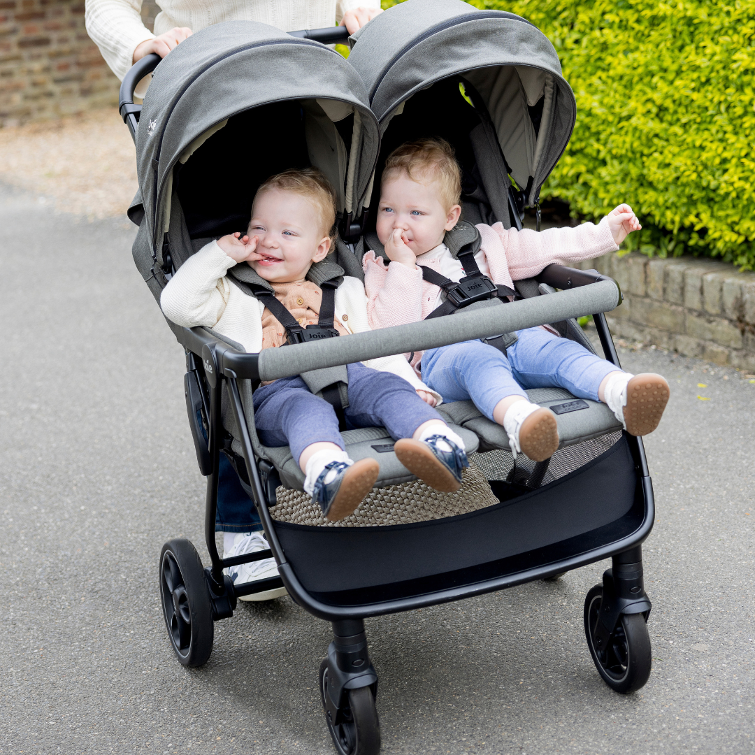 Two children, twice the fun - but also twice the challenges? Not with the Joie Estrella! This well thought-out twin and sibling pushchair combines many practical features so that you are always relaxed when travelling. In the Estrella, your children sit comfortably next to each other and have enough space to explore, relax or even take a cosy nap. Thanks to the individually adjustable backrests and leg rests, each child can find their perfect sitting or reclining position - regardless of whether they both want to sleep at the same time or one still wants to explore the world. The mesh inserts on the canopies not only ensure pleasant air circulation, but also allow you to keep an eye on your little passengers at all times. And if something goes wrong on the way? No problem! The reversible seat covers can be easily cleaned with a cloth and their two designs - with or without quilting - offer visual variety at all times. The high-quality fabrics, elegant leatherette accents and harmonious colours ensure a sophisticated look without compromising on suitability for everyday use. The sophisticated ShoeSaver brake ensures a secure footing, which you simply activate from above without damaging your shoes. And it doesn't matter whether it's sunny or suddenly raining: The water-repellent canopy with UV protection 50+ keeps your children reliably dry and protects them from dazzling light. Despite its size, the Estrella remains surprisingly manoeuvrable and space-saving. It can be folded up compactly with just one hand movement and then stowed away free-standing - perfect for small flats, the car or if you need to make space when travelling. The Joie Estrella accompanies you until your children weigh 22 kg each - for many shared experiences and relaxed outings!