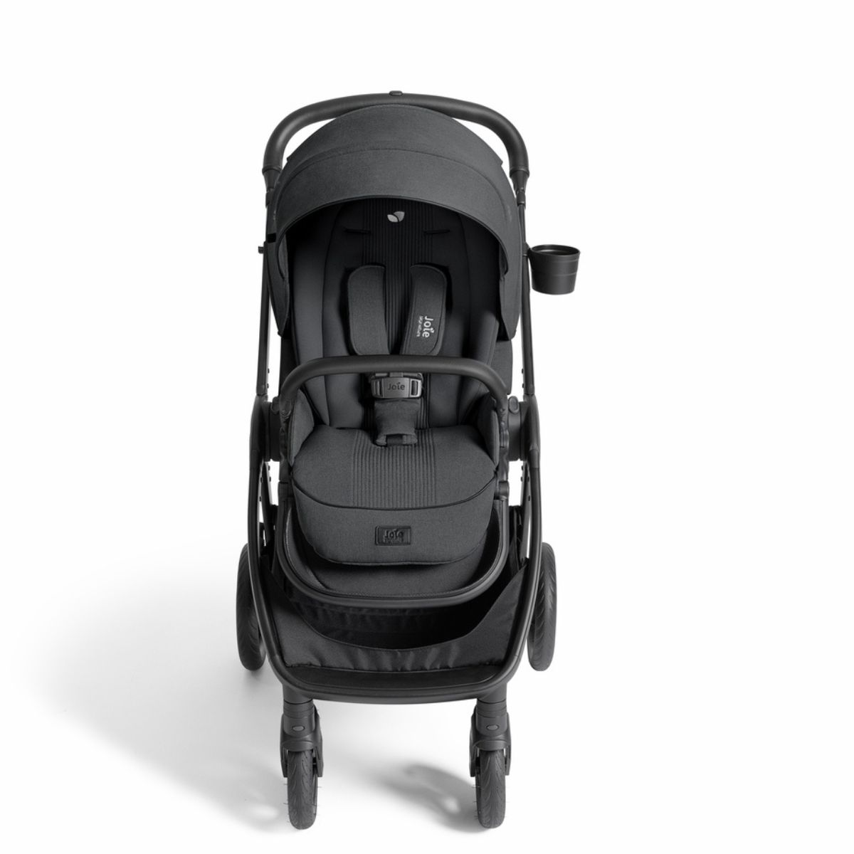 Scope of delivery: Joie Finiti pushchair, incl. Ramble™ XL carrycot, sports seat, harness & backrest padding, one rain cover each for the Ramble XL and the sports seat, cup holder (can hold up to 0.5 kg), adapter (tilt-adjustable and connected with a drawstring, suitable for Ramble xl and infant car seats), belly crossover bag (with harness)