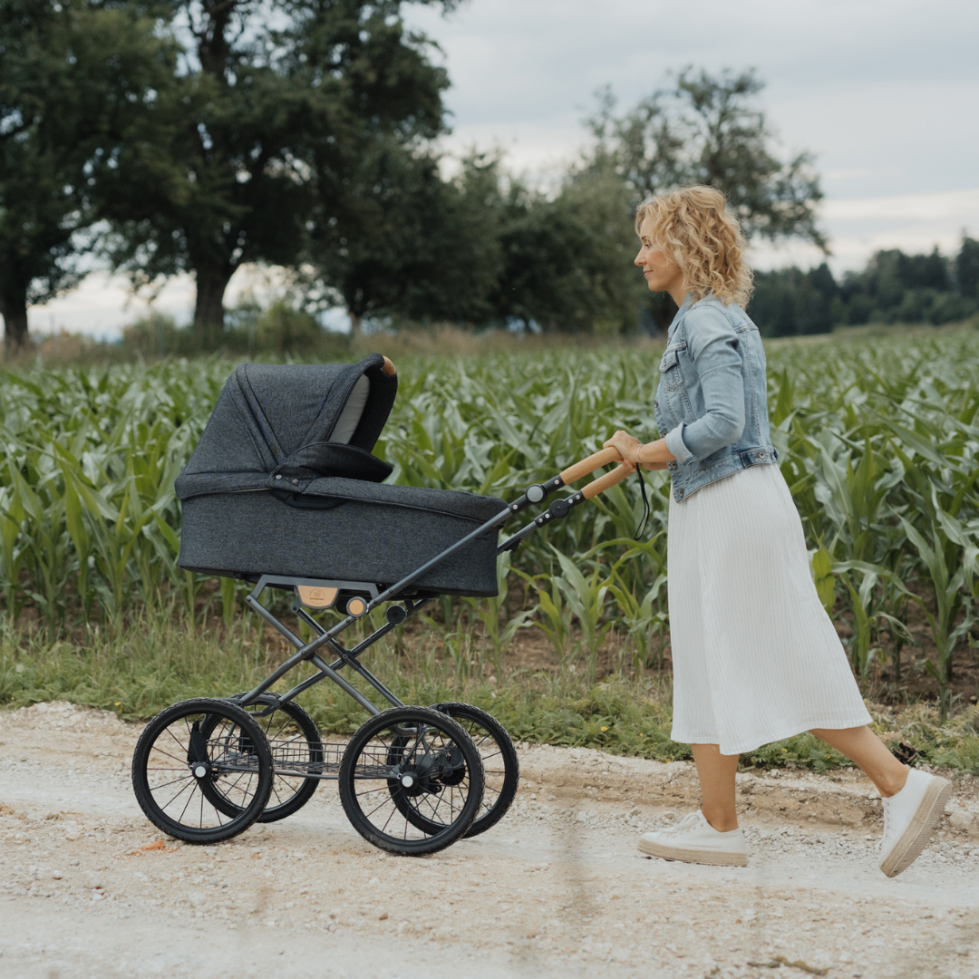 The Ida pushchair combines classic elegance with modern manoeuvrability: thanks to the innovative steering angle of the front wheels, you can easily manoeuvre through narrow alleyways or crowded shops - much more agile than with a typical classic pushchair. The height-adjustable push handle with telescopic joint provides additional comfort - individually adaptable to your height and stride width, so that every walk is as pleasant as a Sunday stroll.