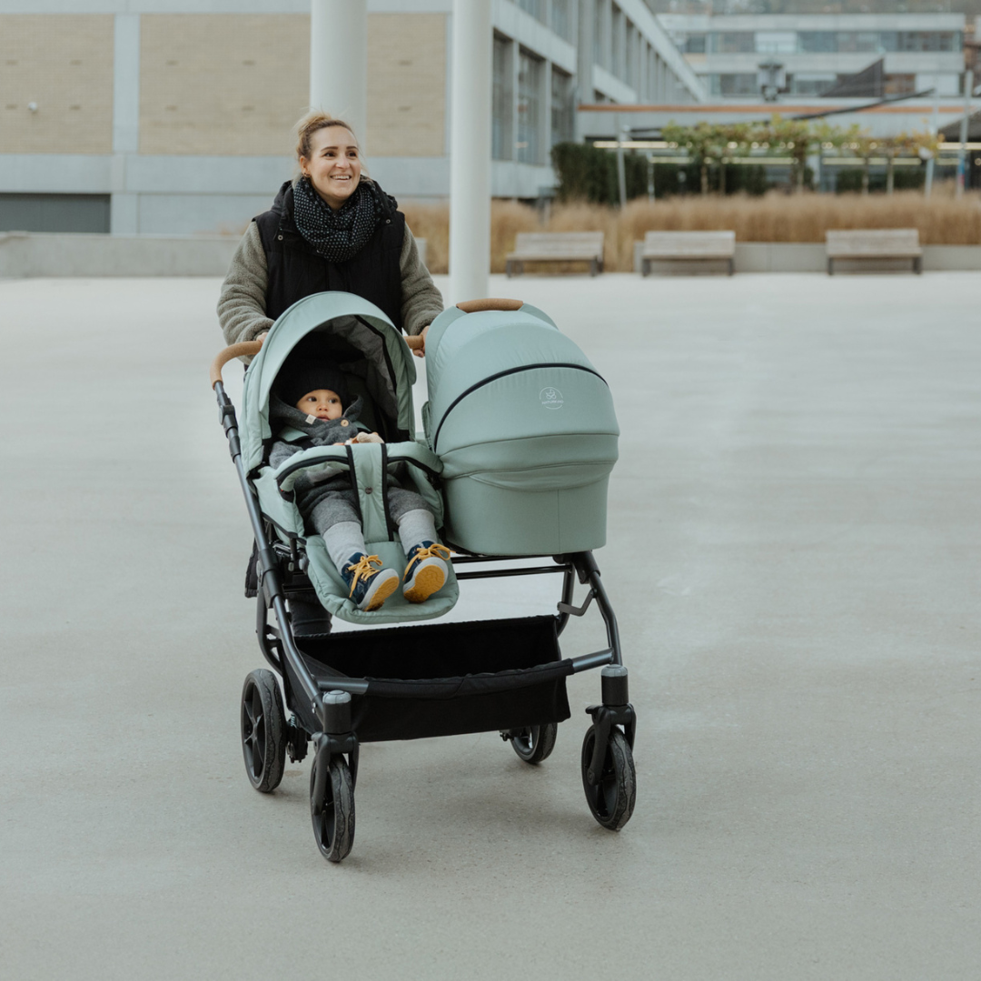 The Naturkind Lars offers versatile equipment options that can be flexibly customised: With the baby basket, it creates a comfortable and safe environment for newborns, equipped with a silently adjustable roof, a practical secret compartment, an ergonomic coconut latex mattress and a rocking function. As a sibling pushchair, Lars combines the baby basket with a reversible seat unit that offers a straight lying surface of 93 cm and a 4-way adjustable backrest. In the version with sports seat and baby car seat, Lars is compatible with all standard car seats using an adapter and allows two car seats to be used side by side.
