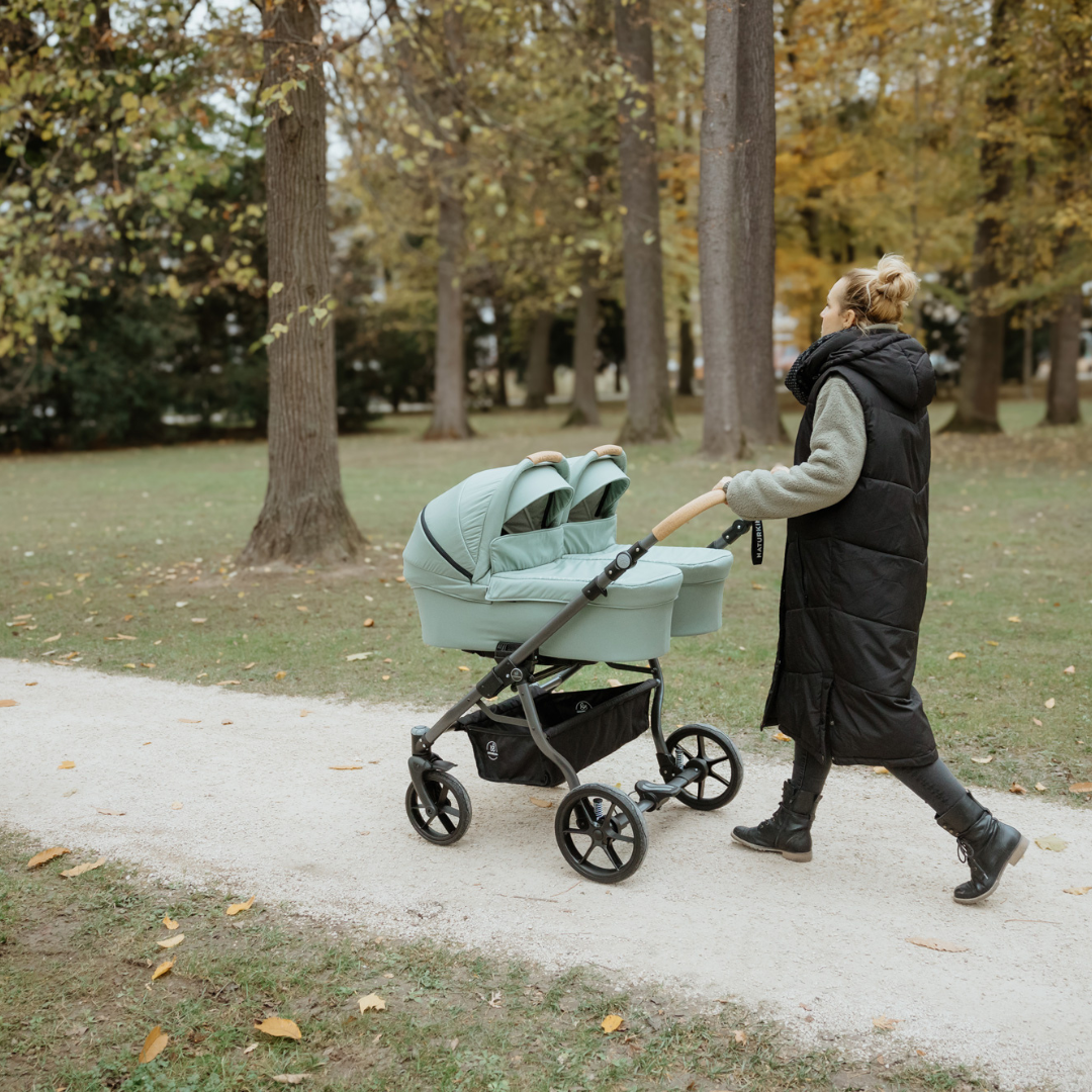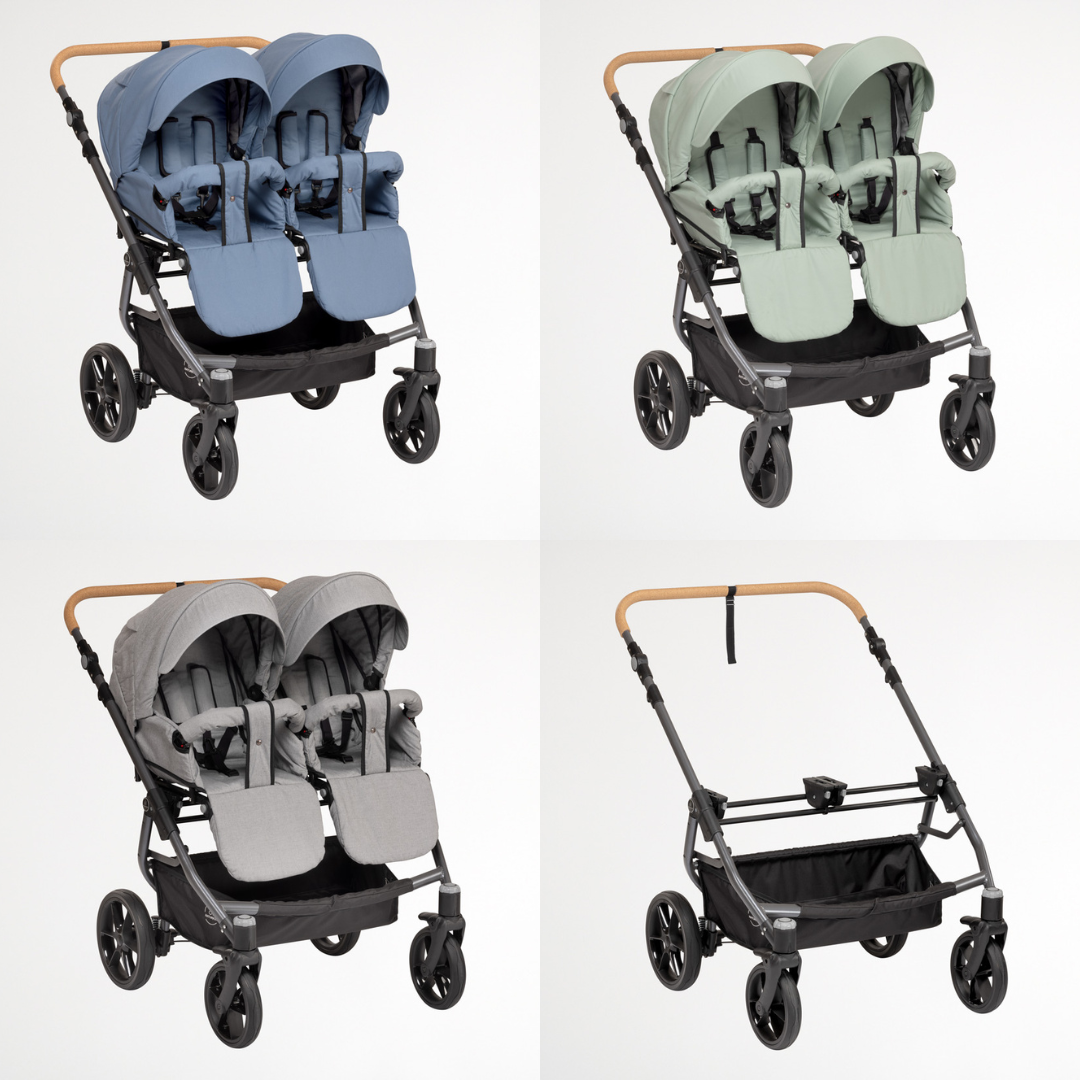 The Lars twin and sibling pushchair is now available in three beautiful designs that perfectly match the tastes of modern parents: the timeless grey "Siebenschläfer" for an elegant look, the stylish, water-repellent green "Jade" and the soft blue "Topas", which is also water-repellent. No matter which design you choose - Lars combines comfort and style for you and your little ones.