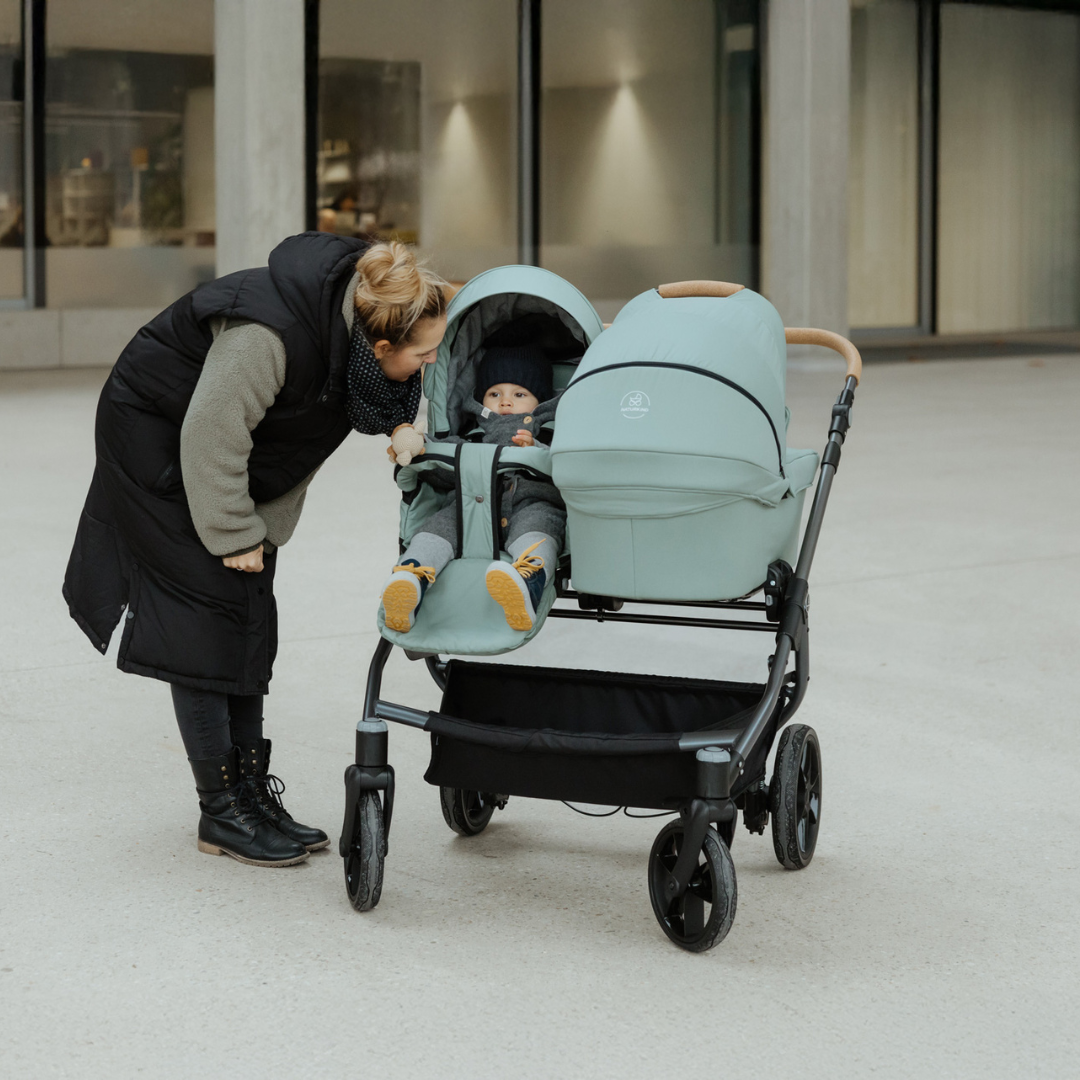 The Naturkind Lars is the perfect companion for active families: as a compact and manoeuvrable twin or sibling pushchair, it fits easily through any standard door and offers both children maximum comfort at the same time. Particularly pleasant when travelling: the front and rear wheel suspension protects your little ones from shocks and can be individually adjusted to the weight of the children - for a smooth and relaxed ride, wherever you go.