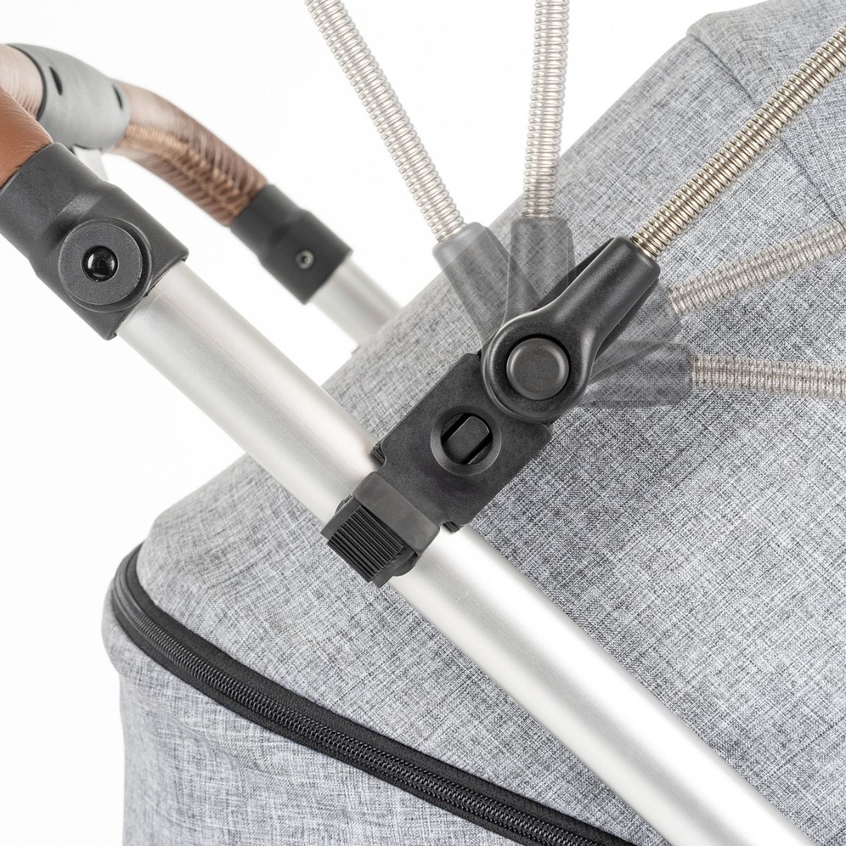 Even if you only go for short walks in the sun, your child's skin is already exposed to harmful sunlight. Baby skin in particular has not yet developed its own protection against UV rays and needs additional protection. This parasol, which you can attach to practically any pram, pushchair or pushchair, is ideal for this purpose. You can adjust the parasol to the position of the sun at any time by using the swan neck joints and the 180° swivel joint. Both assembly and disassembly are extremely easy. The holder can simply remain on the pushchair when you remove the parasol when not in use.