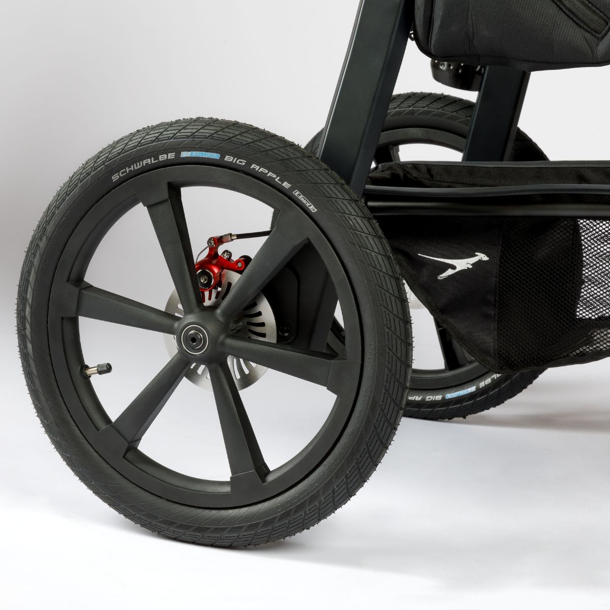 One of the most important features of a jogger pushchair are the brakes. Because you can only accelerate properly with safe brakes. The revised brake system of the TFK Pro has an integrated hand and parking brake that can be operated with one hand and enables fast, safe and precise braking. Even at high speeds, you can reliably maintain control, giving you and your child peace of mind in tricky situations. In addition to a high level of safety, comfort is not neglected. The ergonomic push handle takes the strain off your arms while walking, allowing you to adopt a relaxed posture, which is particularly beneficial on longer walks. The TFK Pro is perfect for forest paths or uneven terrain and is equipped with a combination of 16" rear tyres and 12" front pneumatic tyres. The lightweight aluminium frame makes it easy to handle.
