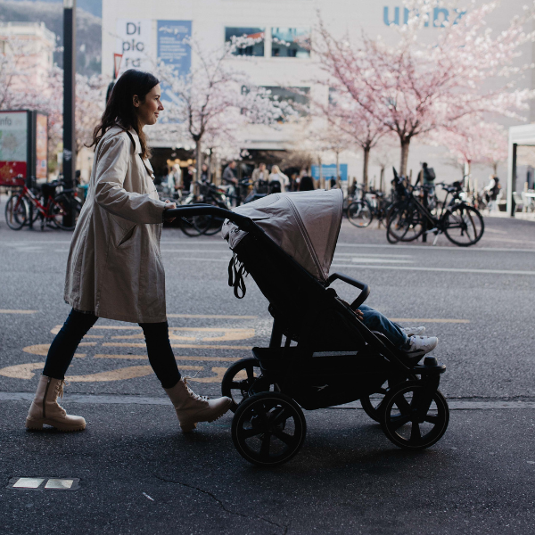 Der Kinderwagen ist mit beweglichen Vorderrädern ausgestattet, um problemlos enge Kurven zu fahren. Die Reifen sind für jedes Gelände geeignet und die Federung sorgt für eine angenehme Fahrt. Wenn Sie den Kinderwagen verstauen möchten, können Sie die Räder ganz einfach abnehmen.